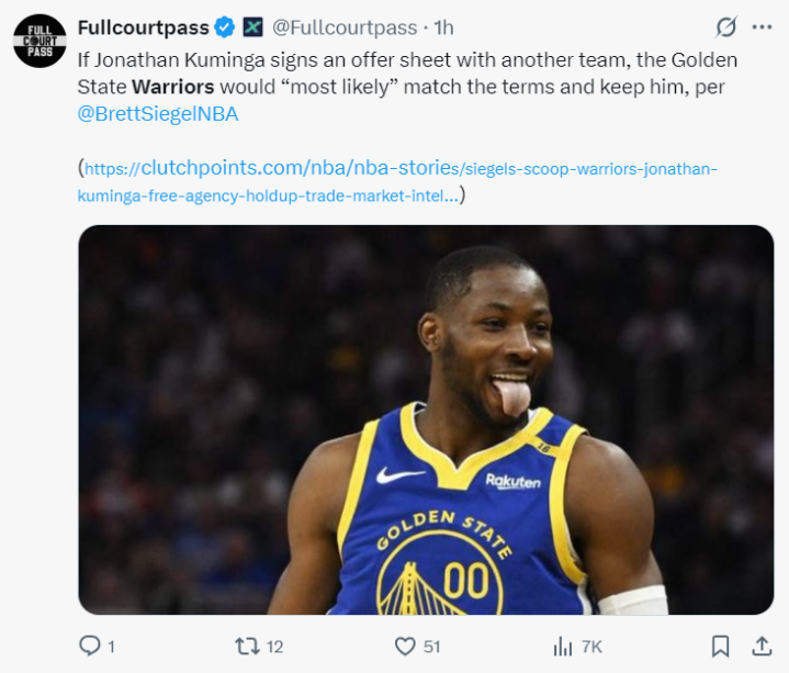 最新的消息是来自NBA记者BrettSigele,如果库明加与一支球队达成的加盟协议,那么勇士很有可能会匹配这份报价留下他。(如此一来库明加就成为勇士队自由市场上最大的引援)