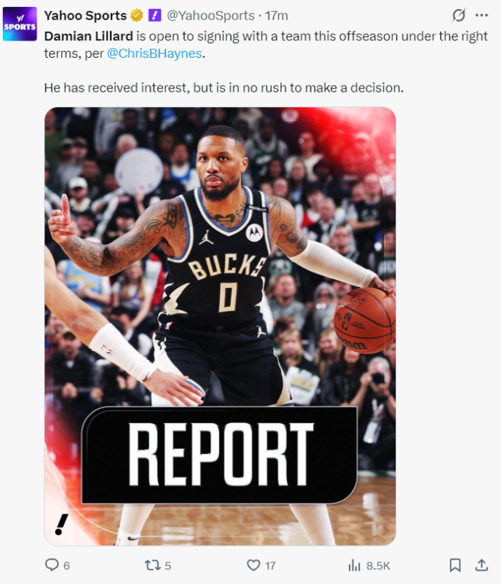 根据《雅虎体育》记者克里斯-海耶斯的报道,利拉德已经收到多支球队的邀请,他对于休赛期加盟其他的球队也持开放态度,但他并不着急做决定。