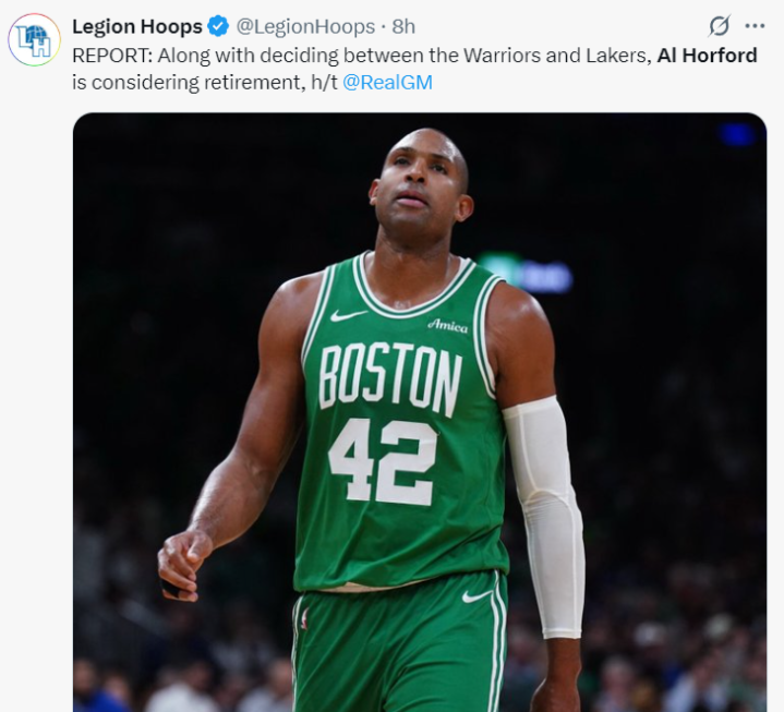 根据美媒RealGM的报道,艾尔-霍福德除了在考虑湖人、勇士之外,他也在考虑退役。