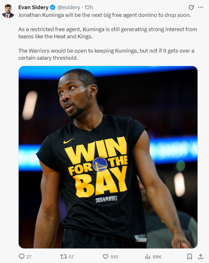 根据NBA记者埃文-斯迪瑞的报道,乔纳森-库明加即将成为自由市场上的关键人物,因为多位自由球员都已经被签下。作为受限制的自由球员,库明加受到热火、国王等球队的关注。勇士也有意留下库明加,但前提是薪资不能超过心理预期。